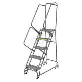 5 STEP INDUSTRIAL STEEL ROLLING LADDER Perfect for use in warehouse, stockroom and maintenance areas. Built to take heavy everyday use. Increase productivity quickly by taking the ladder where the work is. Fast, easy assembly. 14" deep top step. Lock has spring loaded casters that retract when stepping on ladder; rubber feet grip floor. Ladder rolls freely after you step off. Image shown with 6 steps and handrail.